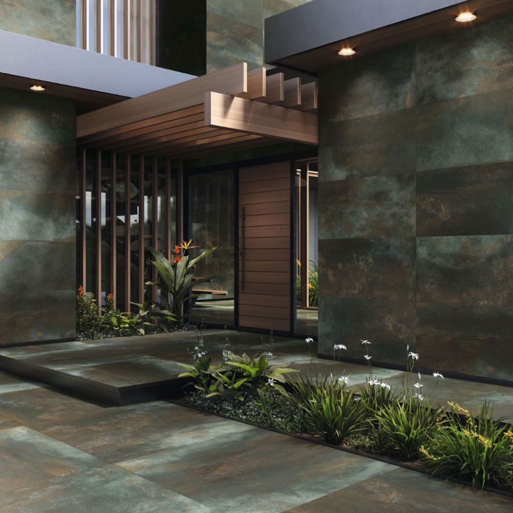 Part of the facade will be covered with METALLIC Wild, a series with an industrial air reminiscent of the effect of the passage of time on construction metals, with a mixture of rust with green tones. In one of the interior ambients is presented METALLIC Urban, which introduces an interesting and captivating blue in its design. The collection is available in 260×120 cm, 120×120 cm and 60×120 cm formats.