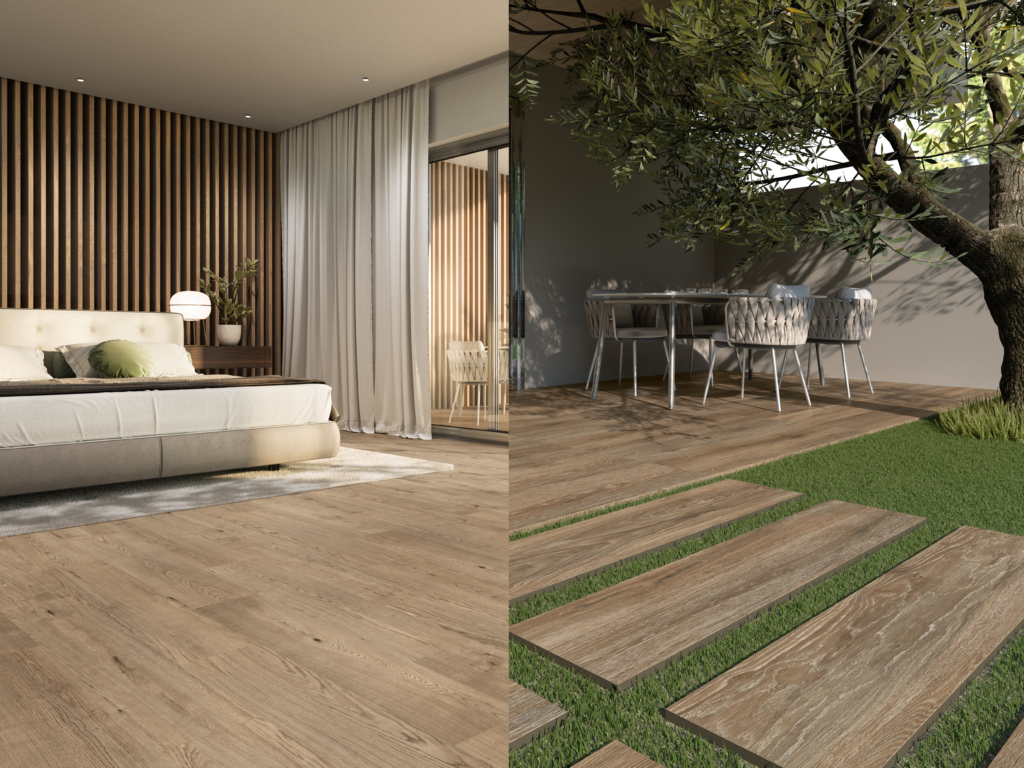When it comes to creating welcoming spaces, there is no material like wood. With a natural appearance and a warm and pleasant tone, this inspiration creates very interesting visual harmonies thanks to its soft style, especially when it features light colours. Ceramics allow you to enjoy the aesthetic benefits of wood with exceptional strength and durability. These are some ceramic proposals inspired by wood for outdoors and indoors. Natural inspirations are the best ally when designing outdoor environments. Wood stands out above all as the natural material par excellence. It transmits peace and enhances the vegetation and other decoration elements, as long as they are consistent with the style. Ducale, Maryland and Otawa show the different aesthetics that wood can project on a terrace depending on the tone. From the lightest to the darkest, each proposal transmits different nuances and allows you to play with the decoration and appear both on the pavement and drawing paths in grassy areas. An incomparable resource. Used indoors, wood projects an air of warmth that is difficult to achieve with any other style. Neutral tones that transmit calm and show their best when bathed in natural light, creating a homey and welcoming atmosphere. Wood inspiration for interior spaces is especially effective in living rooms and bedrooms. On this occasion, Wooden appears with continuity between a room and a balcony, which multiplies the harmony and gives both spaces a single pleasant, serene and Mediterranean style. If you liked these wood-inspired ceramic proposals, visit our products page and filter by effect to find these and other extraordinary collections.Natural looking terraces